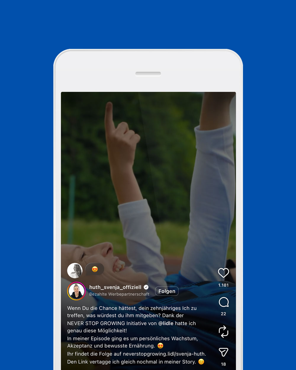 Was würdest du deinem jüngeren Ich sagen, wenn du es treffen könntest? Zur Start der UEFA Women’s EURO 2025 hat Lidl als offizieller Sponsor sechs inspirierende Frauen aus dem Sport zusammengebracht und sie mit ihrem jüngeren Ich begegnen lassen. Die individuellen Stories wurden in Bewegtbild Episoden erzählt, die unter neverstopgrowing.lidl angesehen werden konnten. Außerdem wurden die Episoden in Kooperation mit DAZN auf deren deutscher Plattform augestrahlt. Die Kampagne wurde natürlich mit zahlreichen Assets und Cutdowns über alle Kanäle distribuiert. Den Start der Kampagne feierten wir mit einem großen Kick Off Event moderiert von Laura Wontorra.
