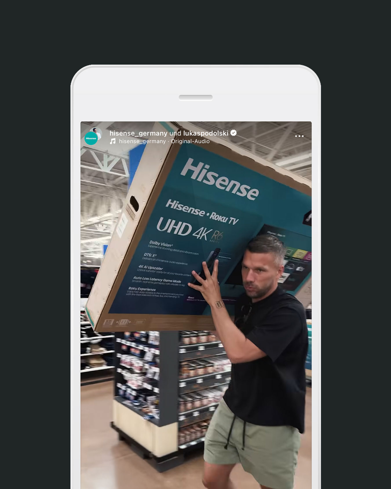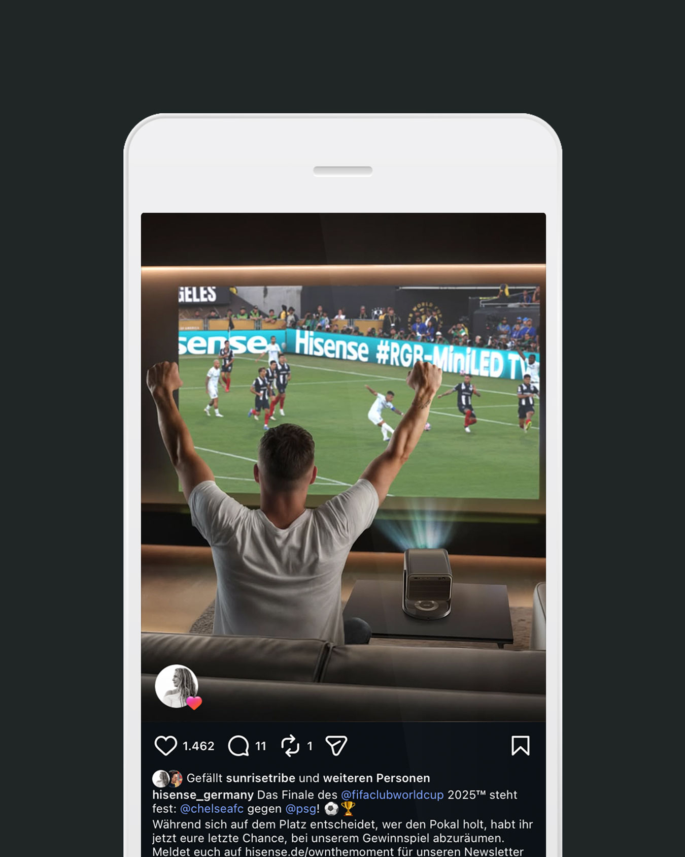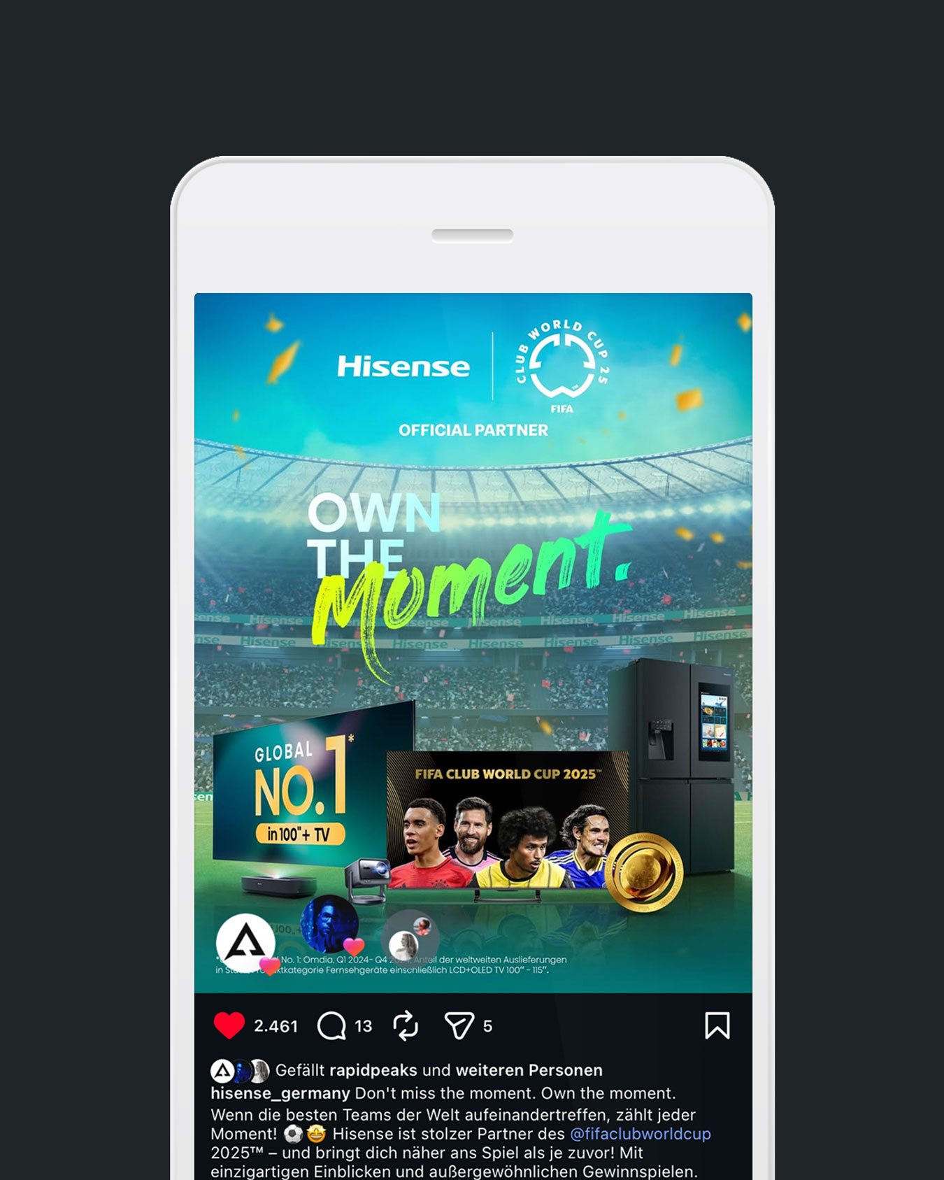 Hisense war offizieller Partner des FIFA Club World Cups 2025™ in den USA. Wir konnten uns im Pitch für die Kreation der Kampagne im DACH Raum durchsetzen. Mit Lukas Podolski etablierten wir einen Fanbassador, der für daheimgebliebenen Fans von vor Ort Eindrücke geteilt hat. Außerdem zierte unsere Kampagne während dem Turnier sämtliche Media Märkte.