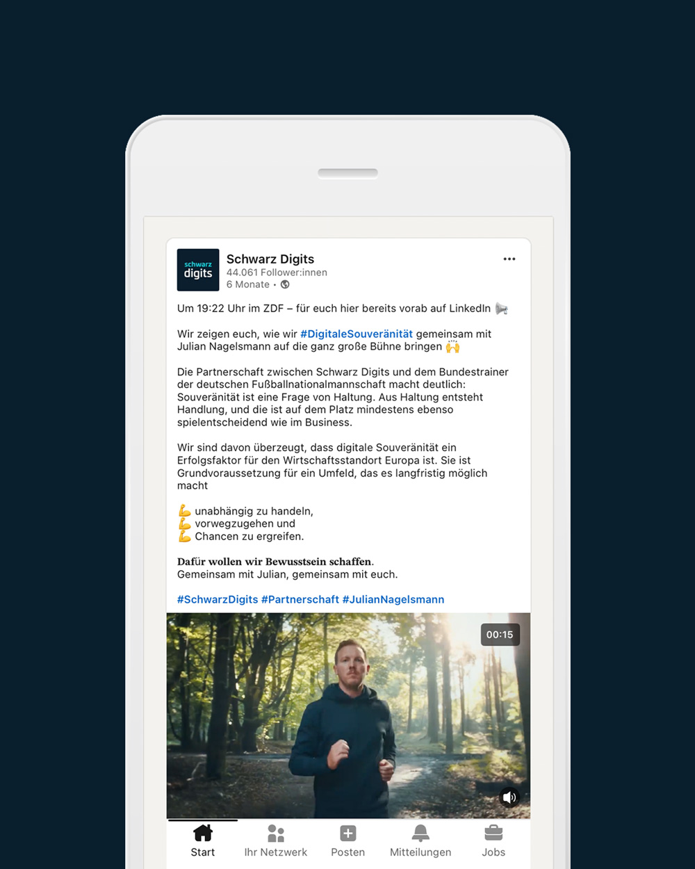Schwarz Digits ist die IT- und Digitalsparte der Schwarz Gruppe. Um digitale Souveränität der breiten Masse zugänglich zu machen folgte Schwarz Digits unserer strategischen Testimonial-Empfehlung. Julian Nagelsmann wurde zum Nations League Final 4 in Deutschland unter anderem mit einem TV-Spot zum neuen Gesicht der Schwarz Digits. Der Spot ist in Zeiten von KI und CGI bewusst als One Taker mit physischer Szenerie in den Bavaria Filmstudios produziert worden. Die nötige Präzision und das nötige Timing stehen wie Julian Nagelsmann und Schwarz Digits für Souveränität. Das MakingOf wurde von Filmmakers World und Daily Dose of Internet gefeatured.